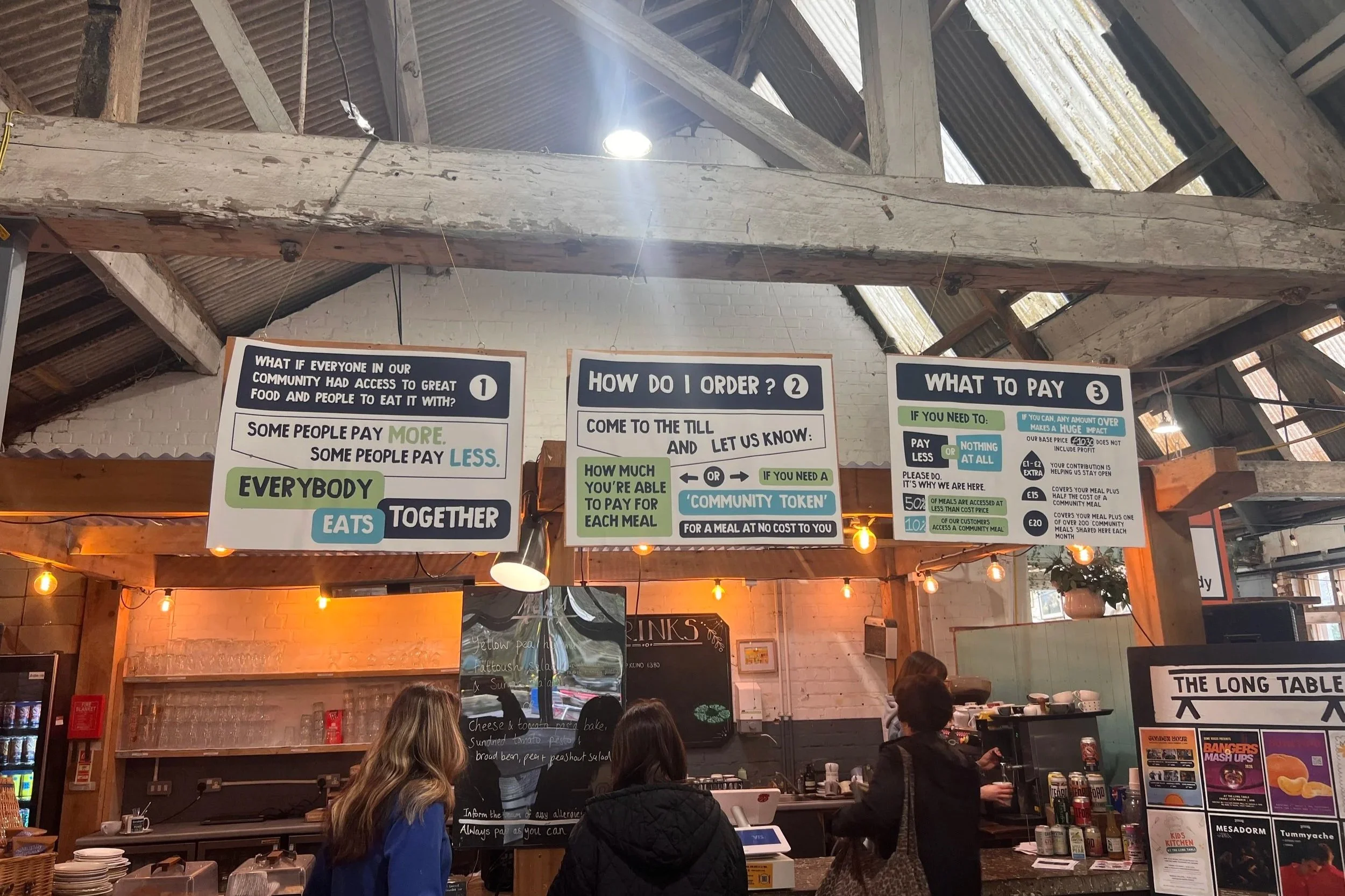 People sitting together at long shared tables. Conversations flowing between strangers. Activities happening around the edges. A sense that eating together actually matters.
